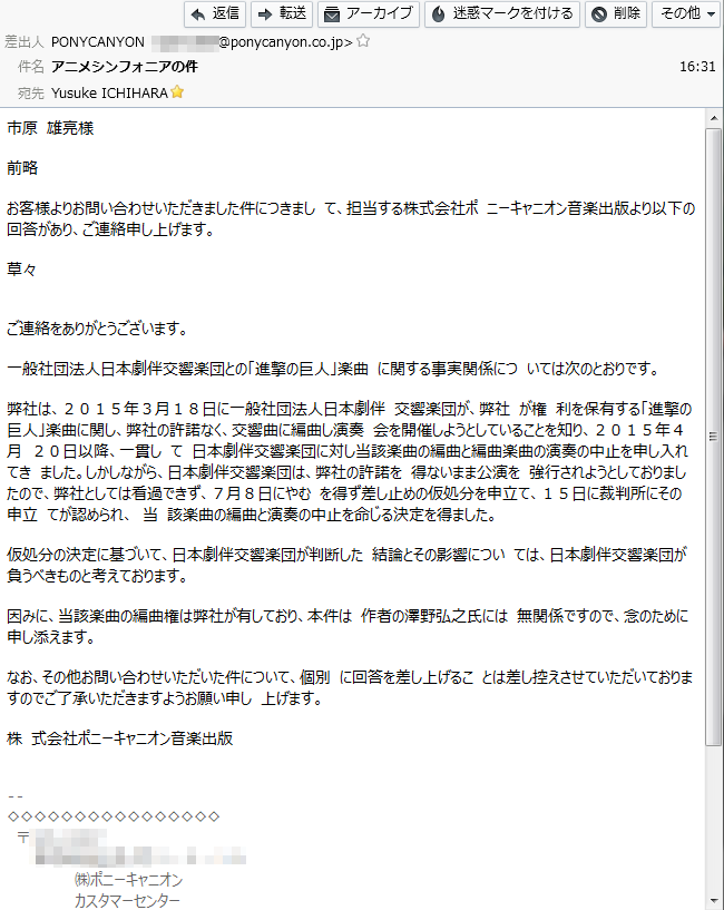 日本劇伴交響楽団のアニメシンフォニアの件をポニーキャニオンに問い合わせてみたんだ