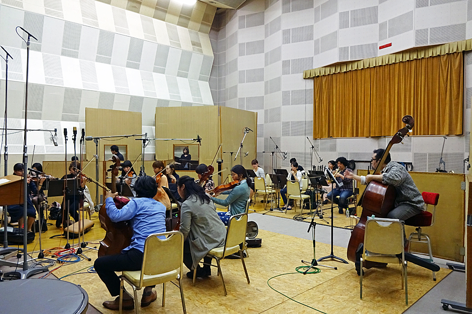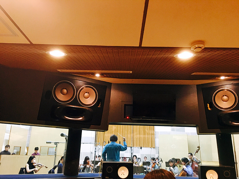 本作のBGMは、新日本BGMフィルが定期的に開催している「NJBP Live!」と同規模のオーケストラによる演奏です。それも楽器毎に個別の録音ではなく、全員がせーので一緒に演奏する、普通にオーケストラとして演奏したものがそのまま使われているのです。演奏する場所がホールではなくレコーディングスタジオであって、お客様の代わりにガラスを隔てたコントロールルームに水田さんをはじめ、羽田さんやエンジニアの方々がいるという違いくらいです。だからこそ指揮者の出番があったわけです。