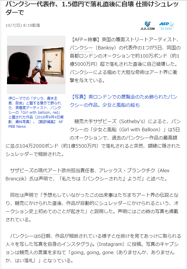 サザビーズで落札されたバンクシーの絵画がシュレッダーにかけられたニュースですが、朝日の第一報(?)で、バンクシーがInstagramに投稿した文章