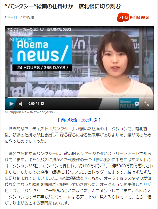 後で見てみたところ、これは恥ずかしいと思ったのか、誤訳に気づいたのか、ニュースの文章が差し替えられ、動画も「行け、行け、行っちゃった」の部分だけカットされておりました。おかげで、映像ではバンクシーのSNSへの投稿が表示されているのに、それには一切触れられない違和感のあるニュース映像になっております。さらに配信時間も最初のままで、訂正が入ったことも書かれていない。マスコミの慣習は知りませんが、これでいいんでしょうか。